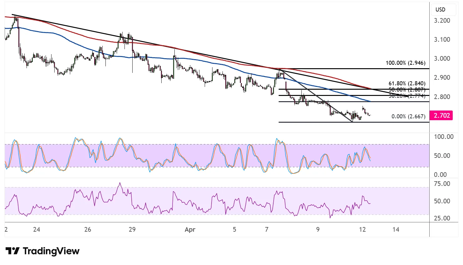 A larger corrective bounce could reach the 61.8% Fib at $2.840, which lines up closely with the descending channel resistance and the converging moving averages, a particularly compelling area of interest for sellers looking to join the downtrend.