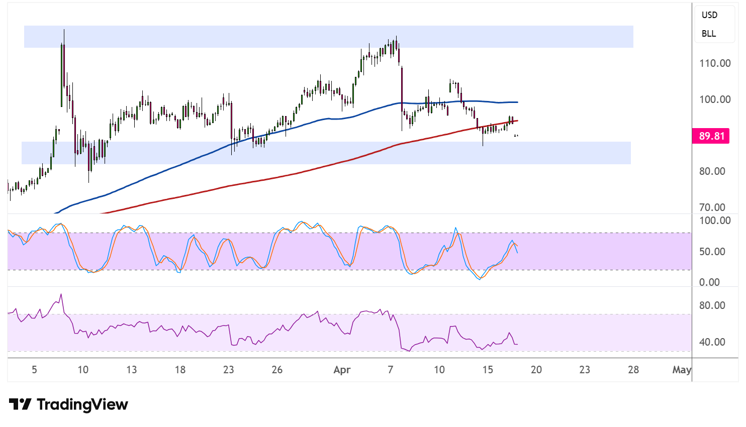Price had been consolidating within a broad range, with the upper boundary capping advances near the $110.00 area and a lower support zone sitting around the $85.00–$88.00 region. The gap lower has dragged crude oil closer to this support floor, and whether buyers can defend this zone will be critical in determining the next directional move.