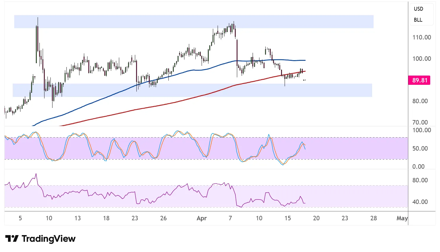 WTI crude oil has tumbled sharply from its swing high around $113 per barrel and is now testing the lower boundary of a wide horizontal range, with price currently hovering at $89.81.