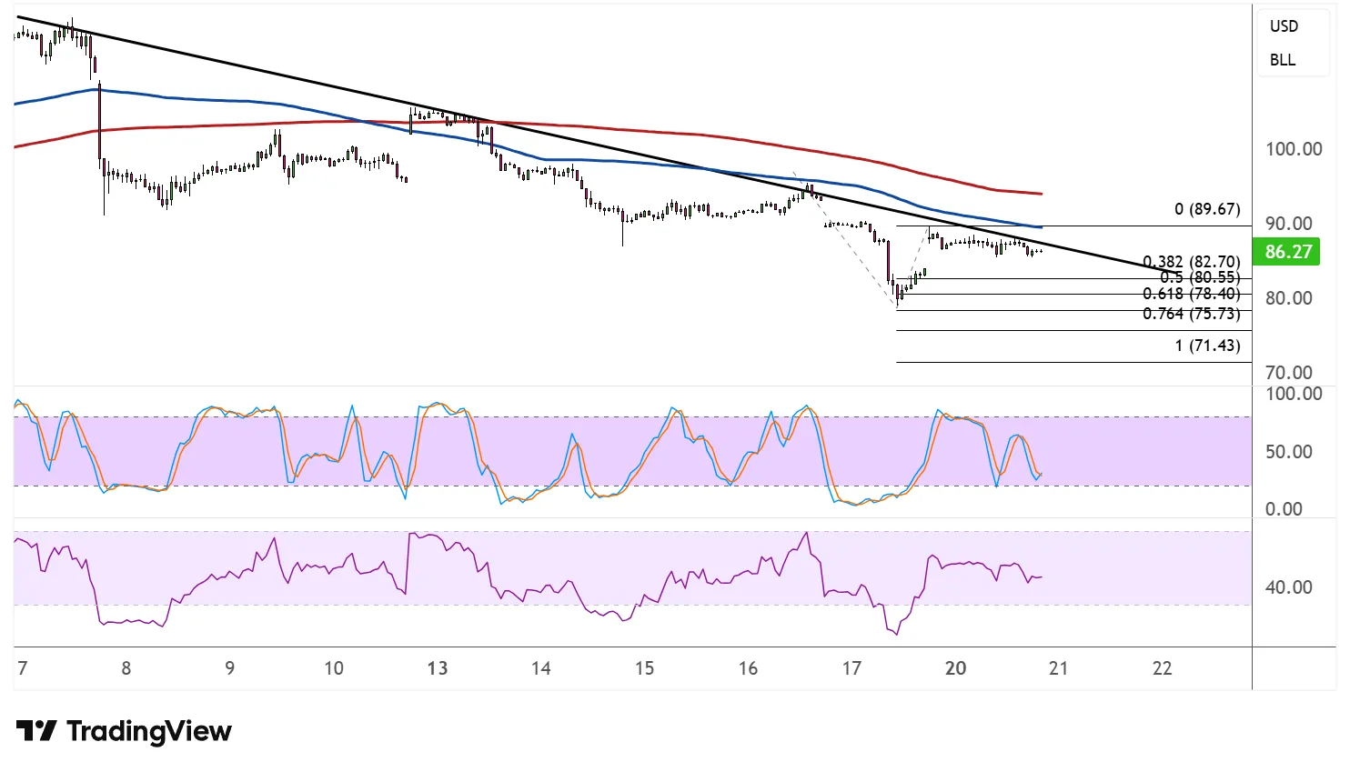 Price is currently hovering around $86.27 per barrel, and the trend line is bearing down overhead, leaving the door open for the selloff to resume.