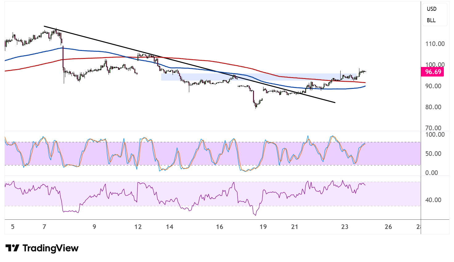 On the moving averages front, price has surged back above both the 100 SMA and the 200 SMA, with the indicators now converging in a tight area around the $92–94 zone. A bullish crossover could follow if the 100 SMA pushes back above the 200 SMA, which would confirm that the path of least resistance is shifting back to the upside.