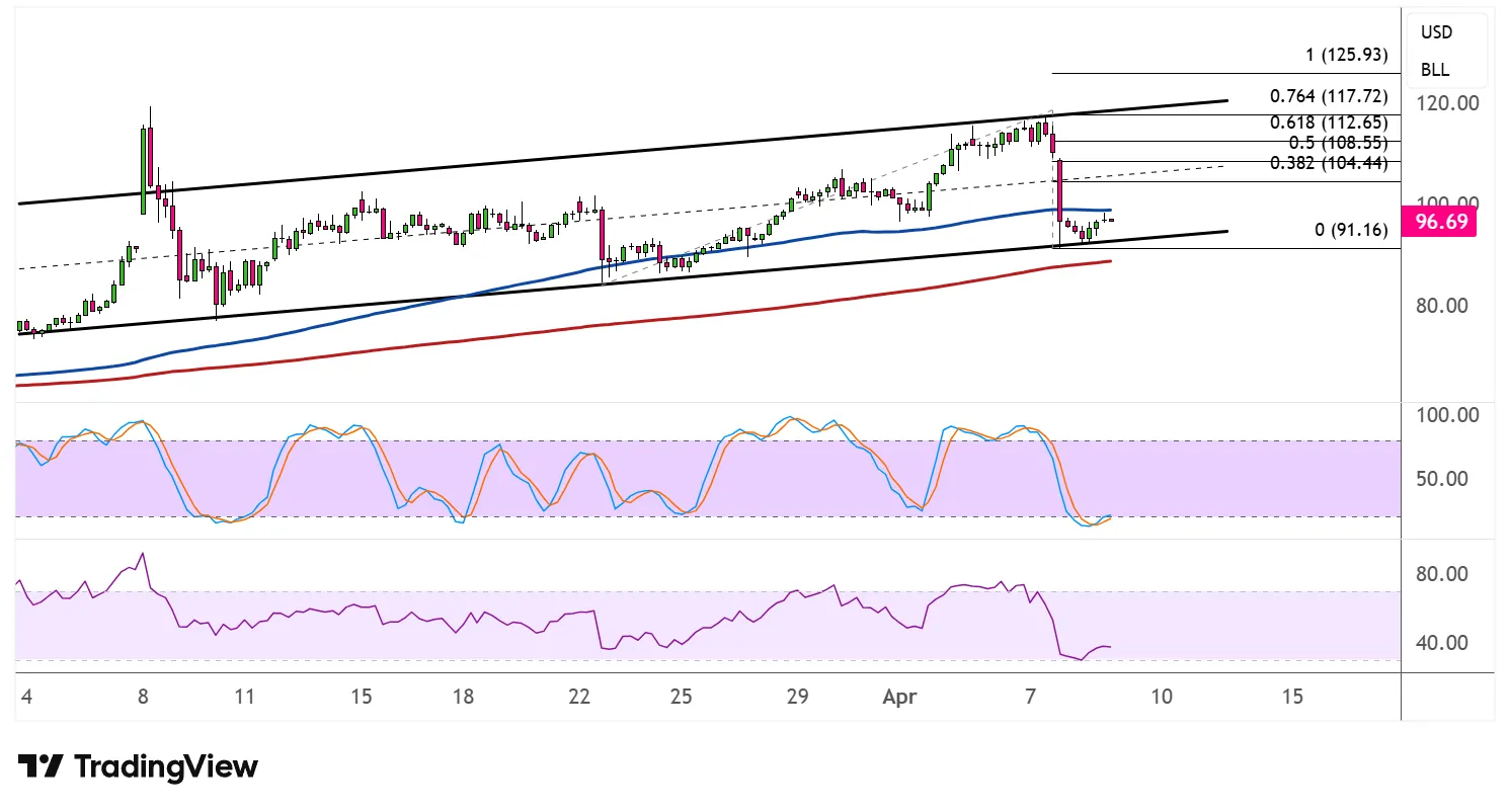 If the channel bottom and moving average support hold as a floor, WTI could resume its climb through the Fibonacci extension targets. A break below the 0.00% level at $91.16, however, would call the broader bullish structure into question.