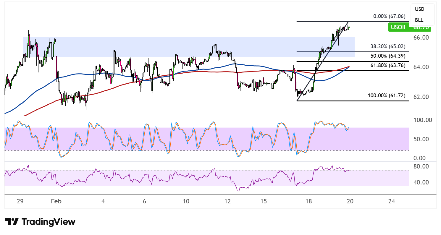 WTI crude oil has staged an impressive rally after bouncing sharply off the swing low at $61.72, breaking above a near-term ceiling and surging past the Fibonacci retracement levels to trade around $66.70.