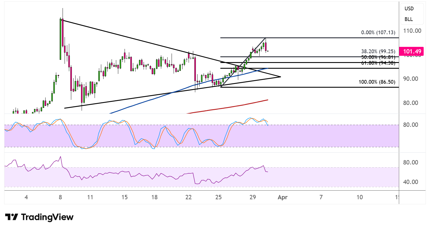 The 38.2% Fib sits at $99.25, representing the nearest potential support on a shallow correction. A deeper pullback could find footing at the 50% level at $96.81, while a more significant retracement could stretch toward the 61.8% Fib at $94.38, which aligns closely with the broken triangle resistance now acting as support. The full swing target at $86.50 serves as the line in the sand for the broader bullish thesis.