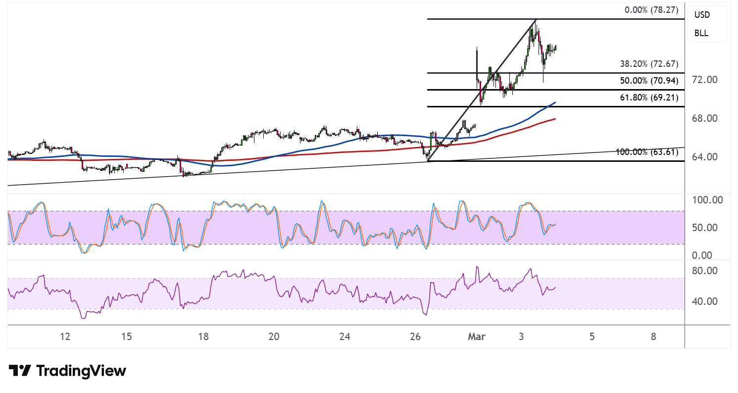 RSI is also pulling back after recently pushing into overbought territory, and likewise has room to decline before hitting the oversold region. If the oscillator stabilizes and turns upward near one of the Fibonacci levels, it could align with a fresh leg higher, potentially sending WTI back toward the $78.27 swing high or beyond.
