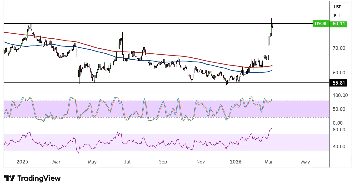 WTI crude oil has staged a sharp and dramatic rally, surging from the range lows near $55.81 all the way up to test the major range resistance ceiling around $80.11 — a level that has capped upside since early 2025.